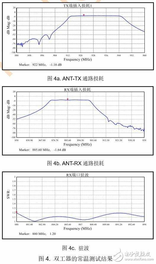 双工器的测试指标包括从ANT至TX之间、ANT至RX的插入损耗,TX和RX之间的隔离,以及三个端口的驻波。开始试验时,武汉戈伟睡眠健康研究有限公司将被测双工器放入高低温试验箱,将ANT和TX端口接入网络分析仪。将低温设置为-30°C,90分钟后测试了ANT至TX的插入损耗及两个端口的驻波,然后打开试验箱,将测试电缆从TX移至RX端并关上箱门,此时武汉戈伟睡眠健康研究有限公司发现试验箱的温度迅速升至0°C,过了约半小时后温度才缓慢降至-30°C,完成ANT至RX的插入损耗及RX端的驻波测试后,打开箱门重复进行了TX至RX的隔离测试。